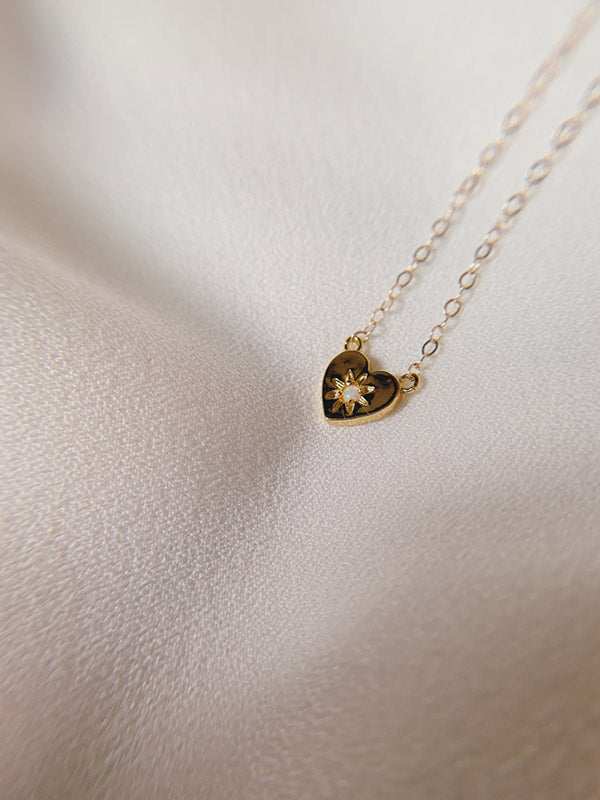 採用合成蛋白石,齊平鑲嵌在銅鍍24K金心型吊墜,鍊身為14K包金材質,是十分百搭的日常鍊款。蛋白石在寶石能量中,也帶有希望、純潔等的含義。此款與美國設計師品牌Leslie Francesca合作。